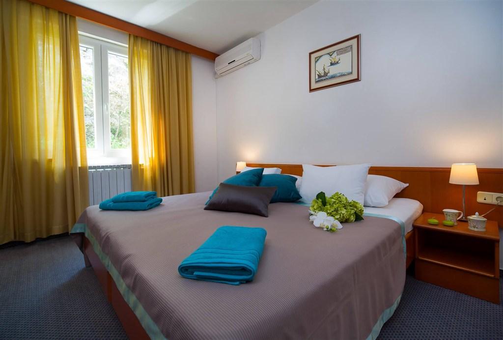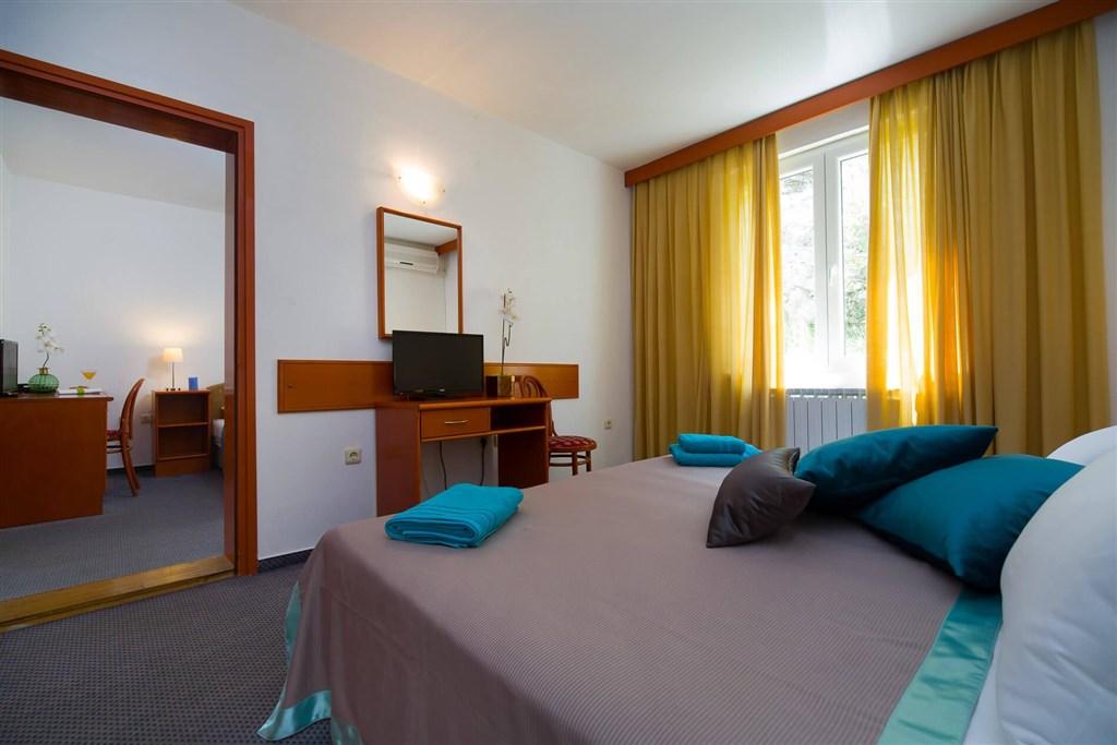 V hotelu jsou pokoje typu Comfort, typu Premier a dále rodinné pokoje. Pokoje Comfort jsou klimatizované dvoulůžkové pokoje bez možnosti přistýlky, s vlastním příslušenstvím, SAT/TV, telefonem, fénem, Wi-Fi a balkonem na mořskou stranu. Pokoje Premier jsou prostornější než pokoje Comfort, mají balkon na mořskou stranu, klimatizaci, SAT/TV, telefon, fén a Wi-Fi. Rodinné pokoje (1/2+2) - 2 propojené klimatizované pokoje (jeden s manželskou postelí, jeden se 2 lůžky) s telefonem, fénem, Wi-Fi, 2 koupelnami a 2 x SAT/ TV. Rodinné pokoje na parkovou stranu jsou bez balkonu. Lednička na pokoji na dotaz a za poplatek. |