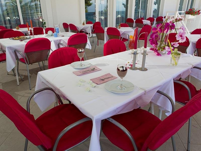 V klimatizované restauraci, all inclusive - plná penze formou švédských stolů včetně nápojů (červené nebo bílé víno, pivo, nealkoholické nápoje), denně 10.00-23.00 hod. v all inclusive baru u bazénu místní alkoholické a nealkoholické nápoje, pivo, červené nebo bílé víno, denně 16.00- 17.00 hod. občerstvení (káva, čaj, sušenky), možnost objednání pouze snídaně nebo polopenze. Dalmatská večeře s místními specialitami 1x týdně. |