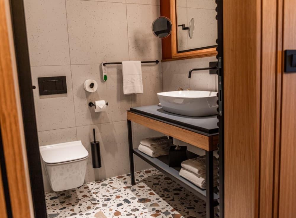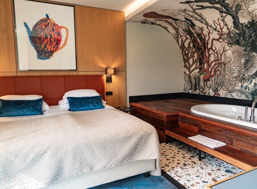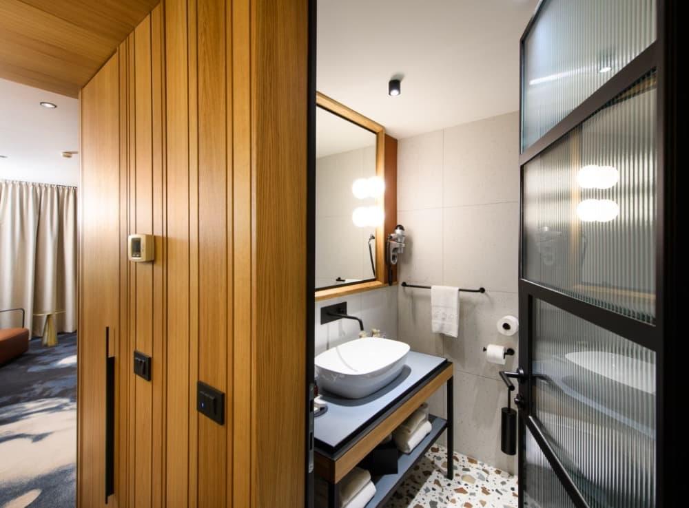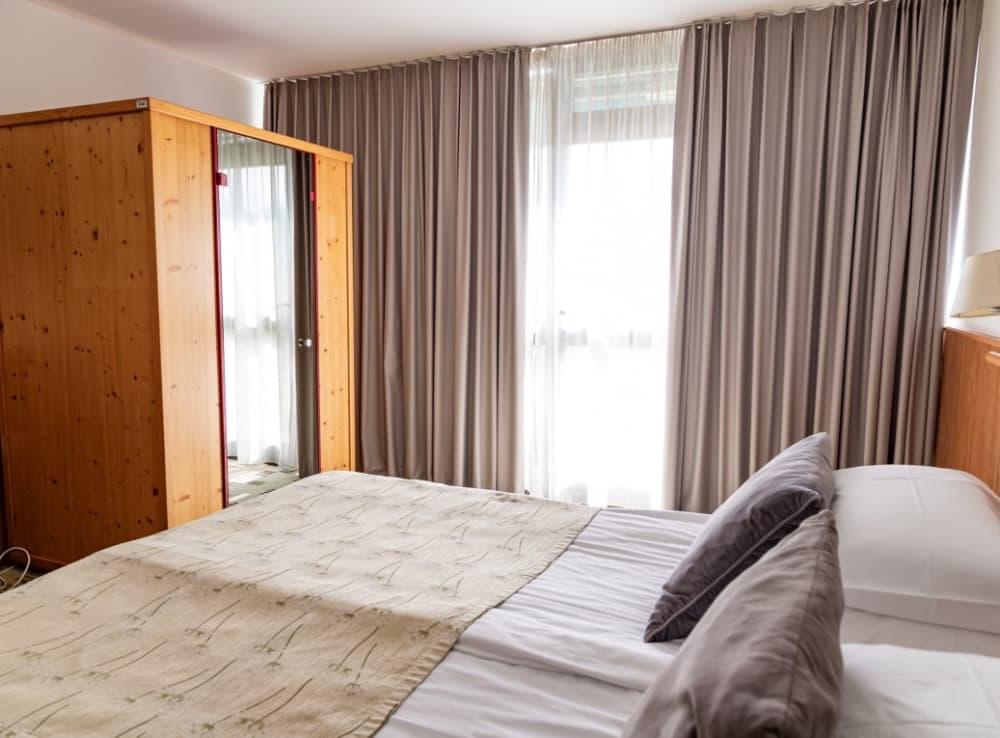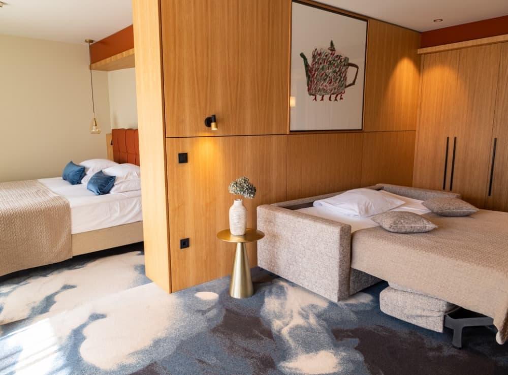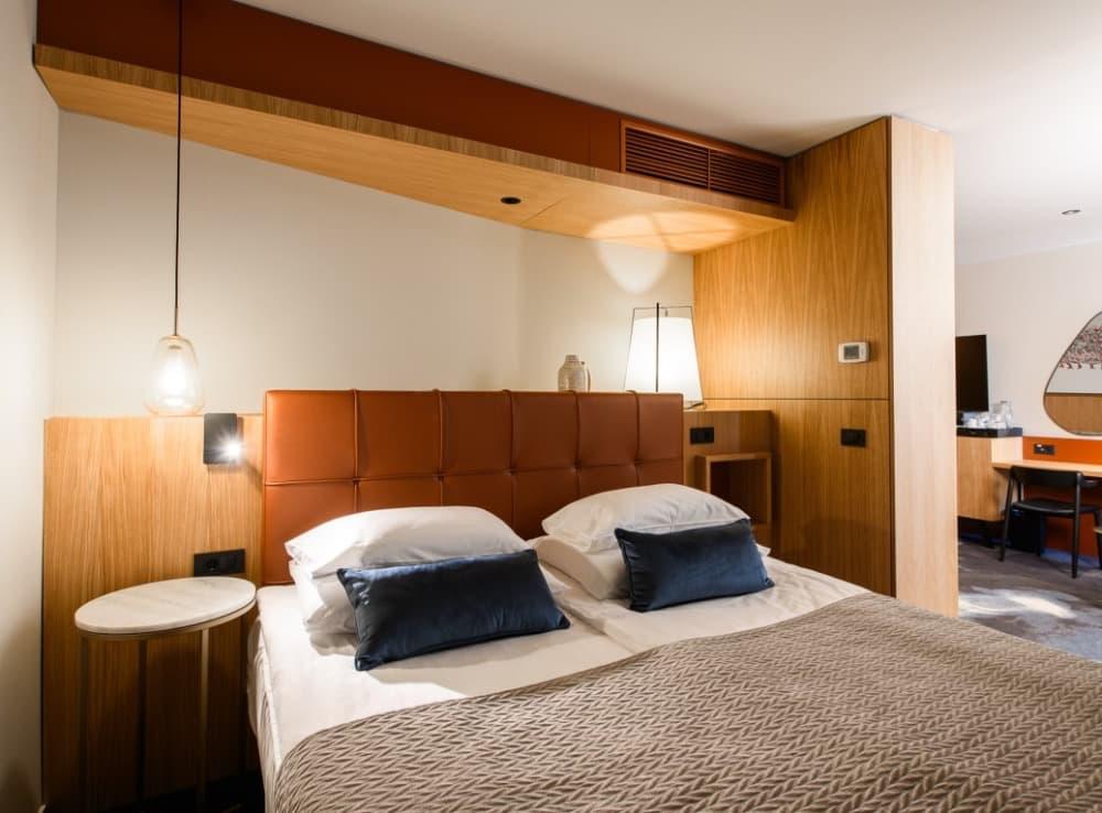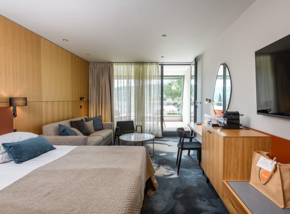 Suite - Užijte si apartmá o rozloze 34 m² s infračervenou saunou a oddělenými obývacími a spacími částmi. Apartmá je vybaveno manželskou postelí a pohovkou, kterou lze použít jako přistýlku, dále velkou LCD televizí, minibarem a balkonem s výhledem na park a lagunu Suite pro 4 dospělé osoby nebo 3 dosp. osoby a 1 dítě do 14,99 let