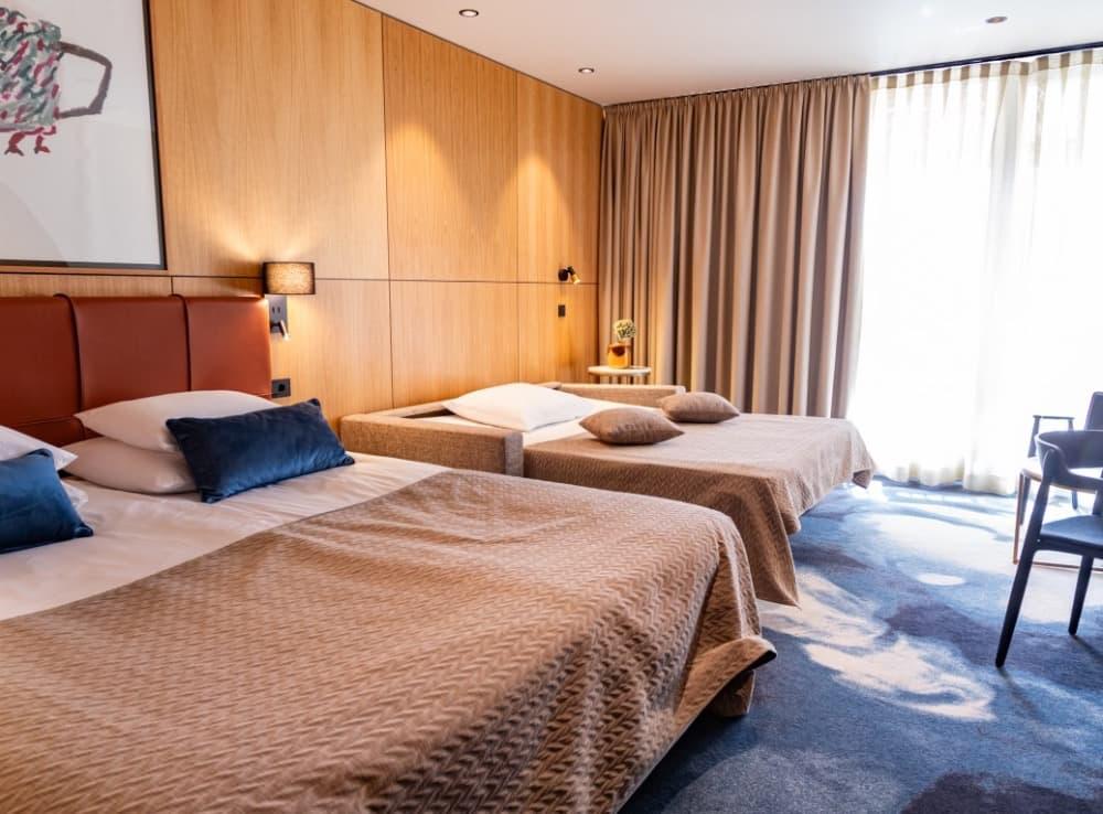 Comfort dvoulůžkový pokoj s přistýlkou - pokoj větších rozměrů až pro 4 dospělé osoby, sprcha a WC, fén, SAT-TV, minibar, klimatizace, balkon, rozkládací pohovka pro 2 dospělé osoby nebo 1 dosp. a 1 dítě do 14,99 let